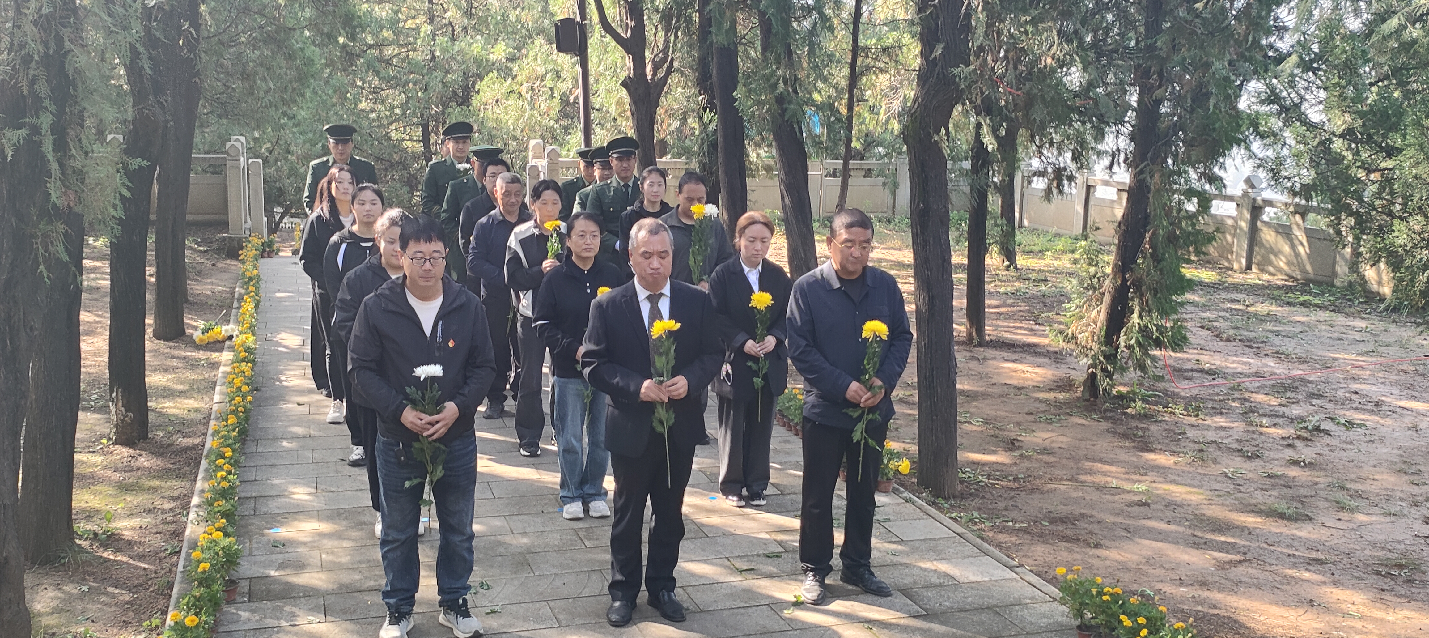 陵园内松柏苍翠,烈士纪念碑巍峨矗立,镌刻的文字诉说着先烈的赤诚与无畏。活动伊始,全体人员身着整洁服装,整齐列队于纪念碑前,神情肃穆。雄壮的《中华人民共和国国歌》响彻陵园,激昂旋律中,先辈们挺身而出、舍生取义的画面在众人心中浮现。国歌落定,全场肃立默哀,静静追思那些为今日山河无恙献出生命的英雄儿女,传递着干部职工们对烈士的深切敬意。