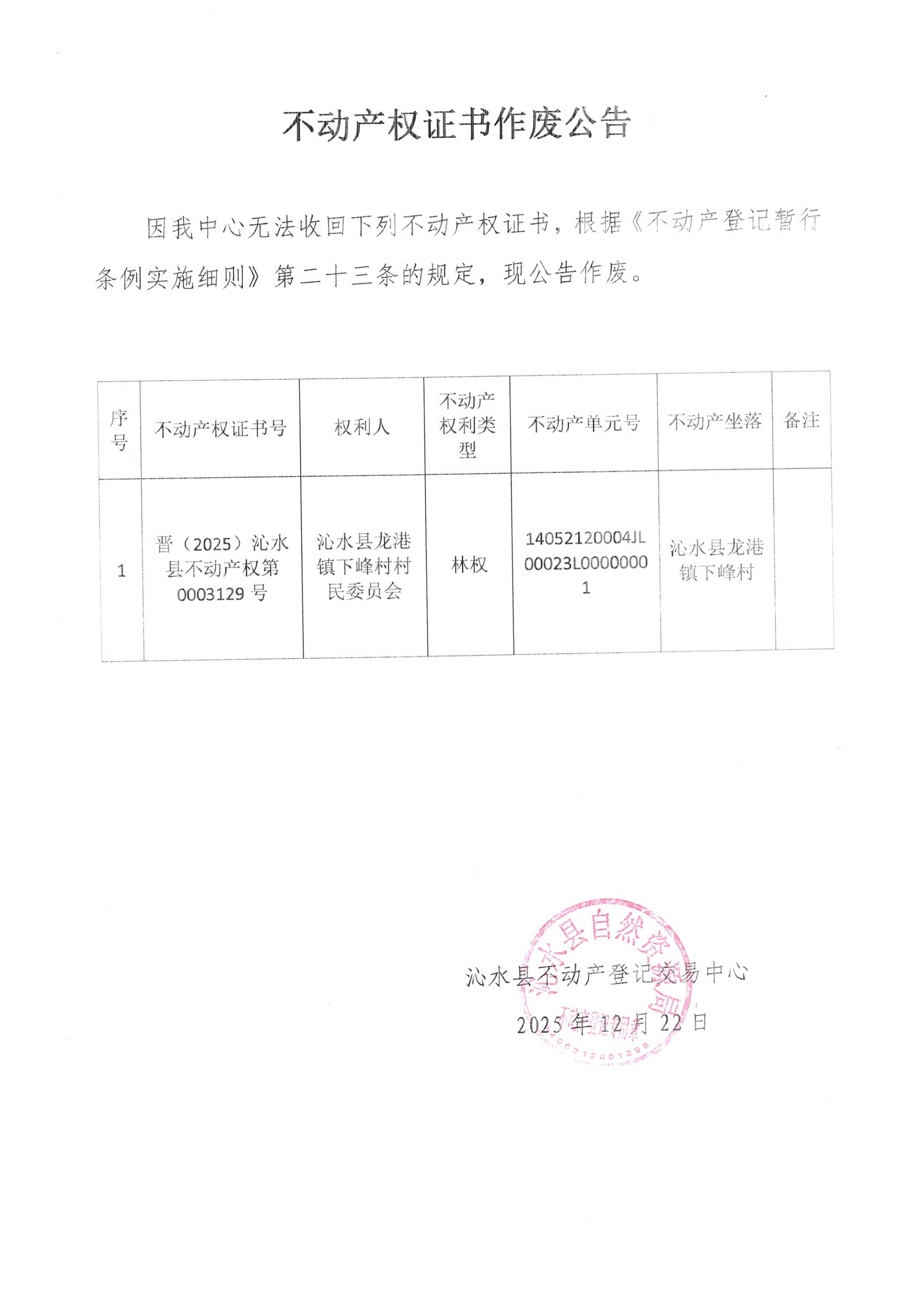沁水县龙港镇下峰村村民委员会不动产权证书作废公告